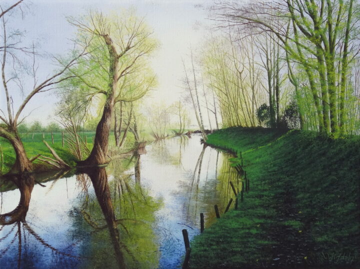 Das Bild zeigt eine Winterlandschaft von 2025 an der Wurm in Heinsberg. Das Bild ist mit feinster Künstlerölfarbe auf Leinen-Keilrahmen gemalt. Die Ränder sind auch bemalt.